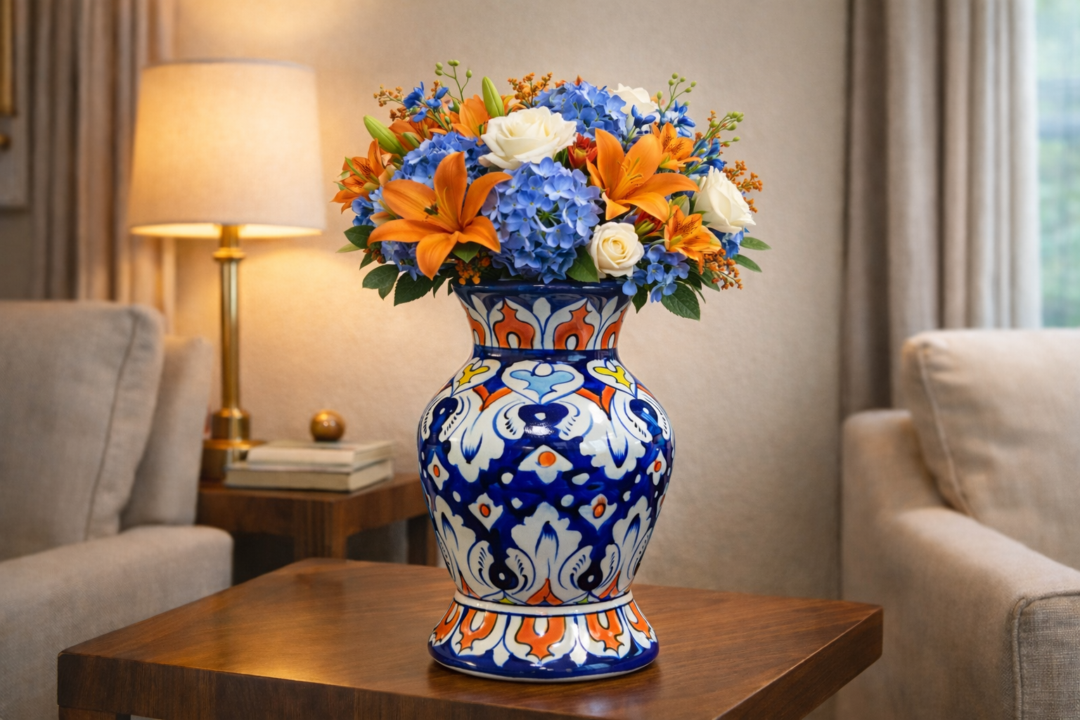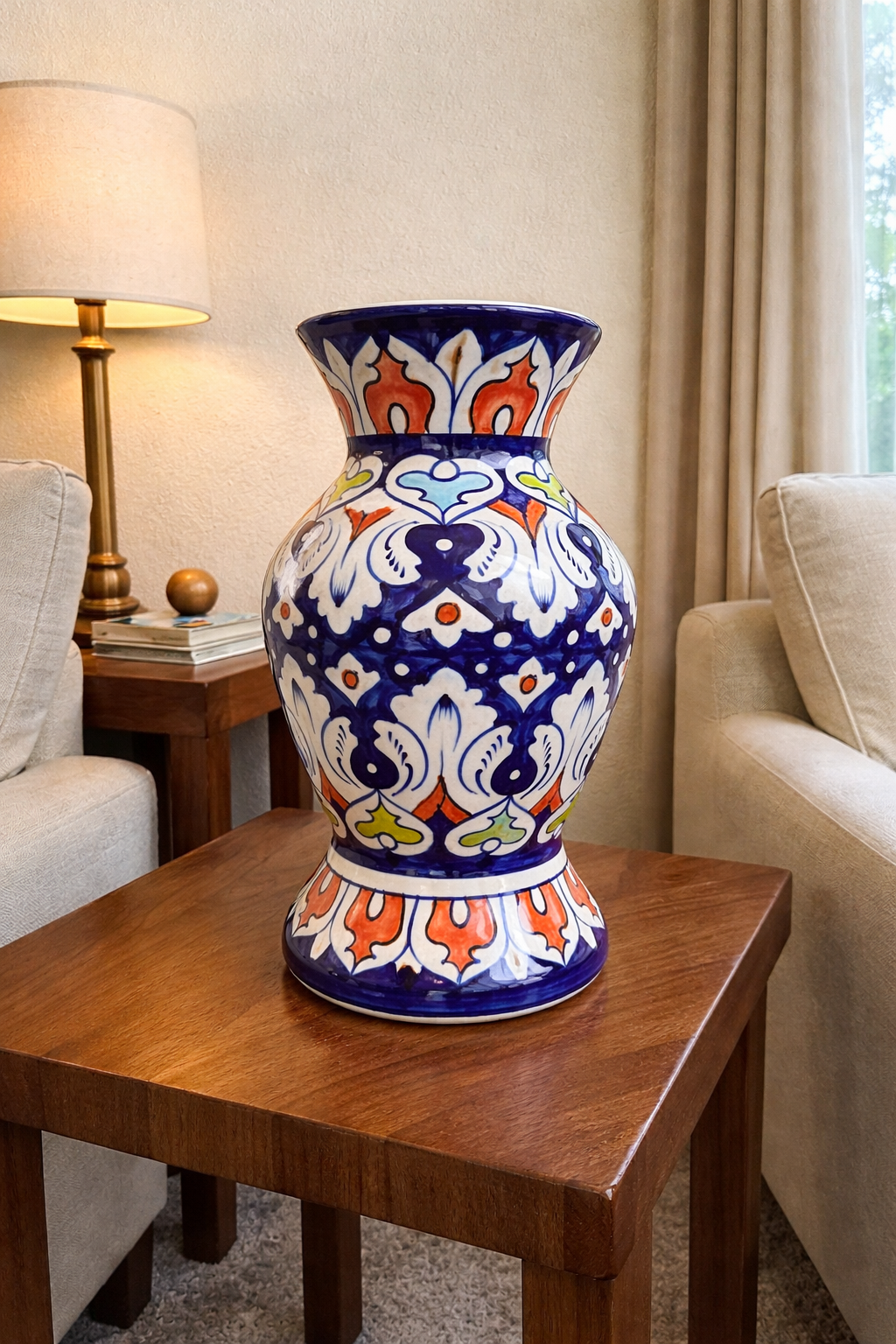 Bring timeless craftsmanship and vibrant artistry into your home with this 12-inch handcrafted Blue Pottery Vase, beautifully designed with intricate floral motifs in deep cobalt blue, orange, light blue, and subtle green accents.