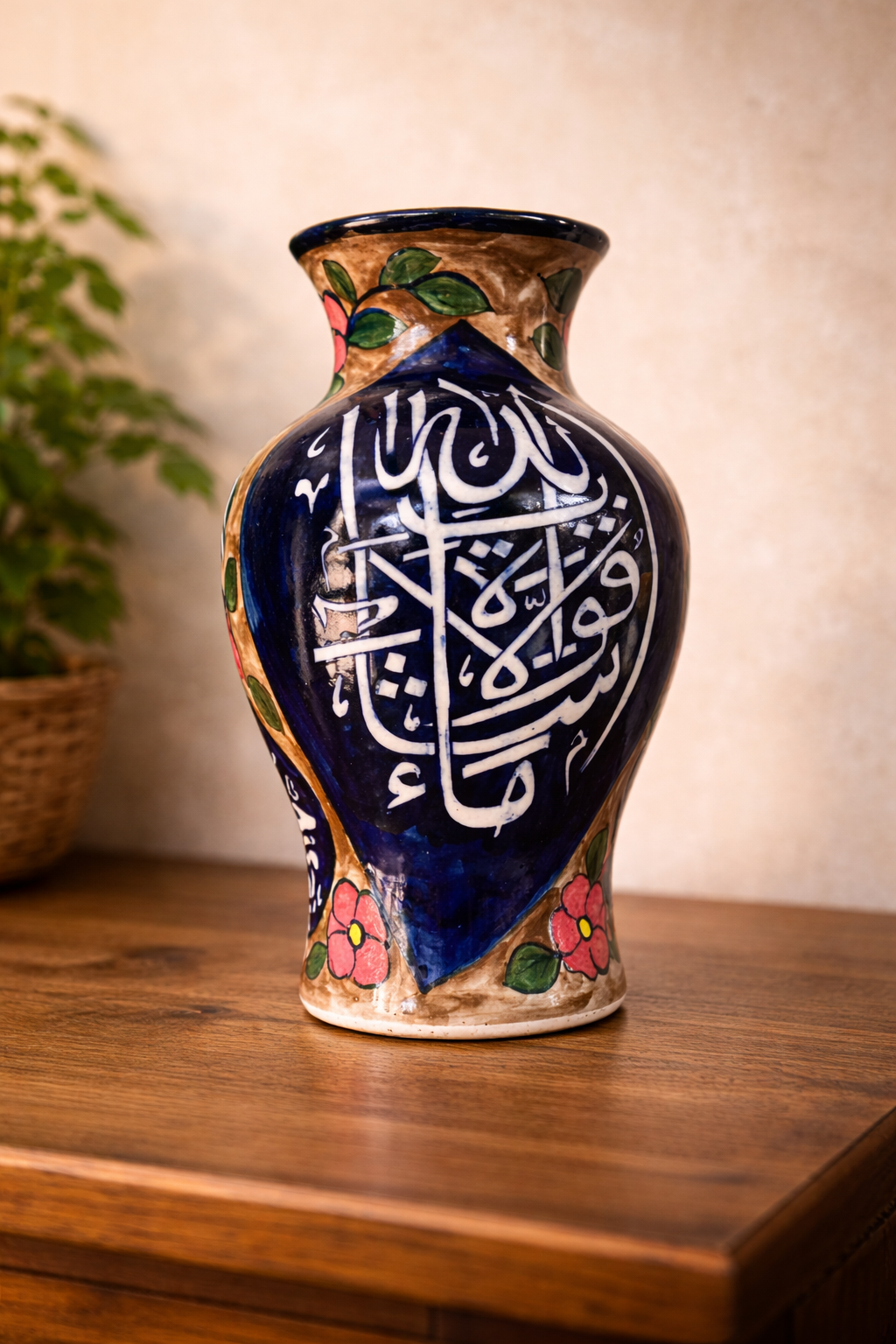 Bring sophistication and artistic heritage into your home with this stunning 14-inch handcrafted ceramic vase. Designed with bold white Arabic calligraphy over a deep royal blue base, this piece reflects timeless craftsmanship and cultural elegance.