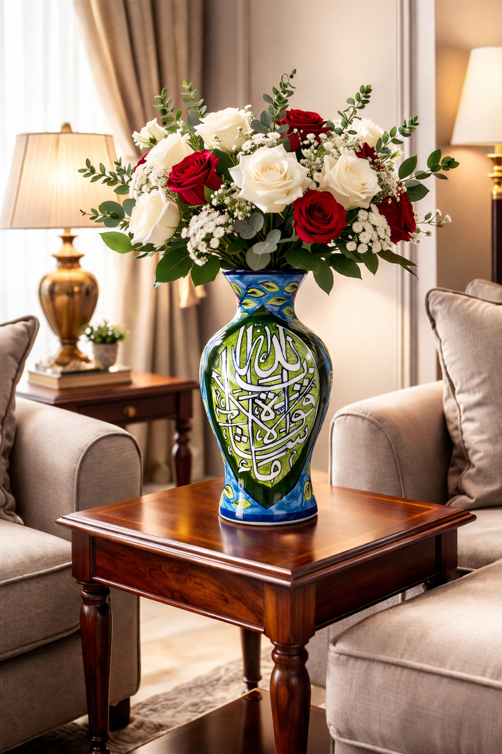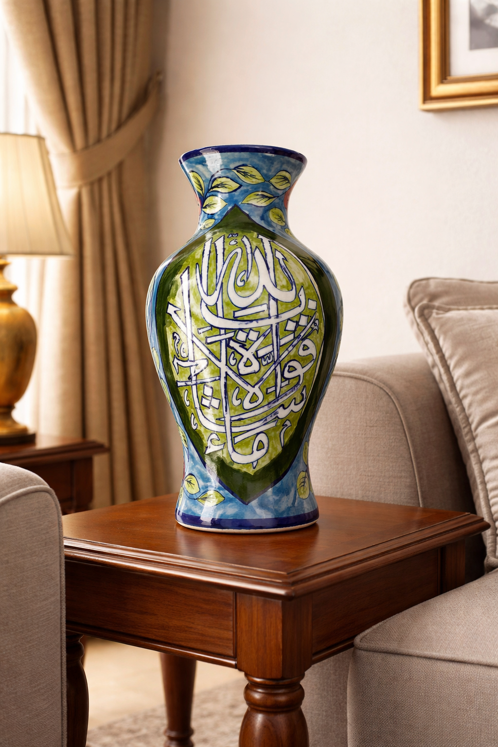 Add timeless elegance and cultural artistry to your home with this beautifully handcrafted 14-inch ceramic vase. Designed with intricate Arabic calligraphy and detailed leaf motifs, this decorative piece blends traditional craftsmanship with modern luxury styling.