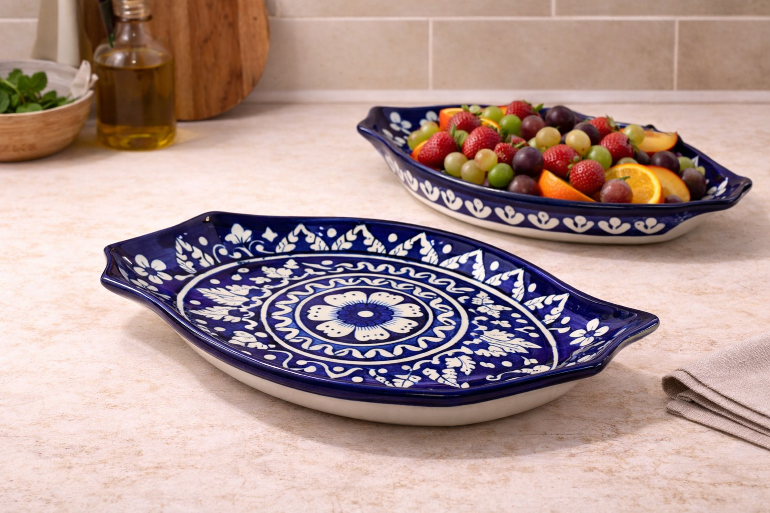 Bring timeless elegance to your dining experience with this 15-inch Handmade Blue Pottery Serving Dish, beautifully crafted with a traditional floral mandala design in classic cobalt blue and white. Inspired by heritage blue pottery art, this large ceramic platter adds sophistication and charm to any table setting.