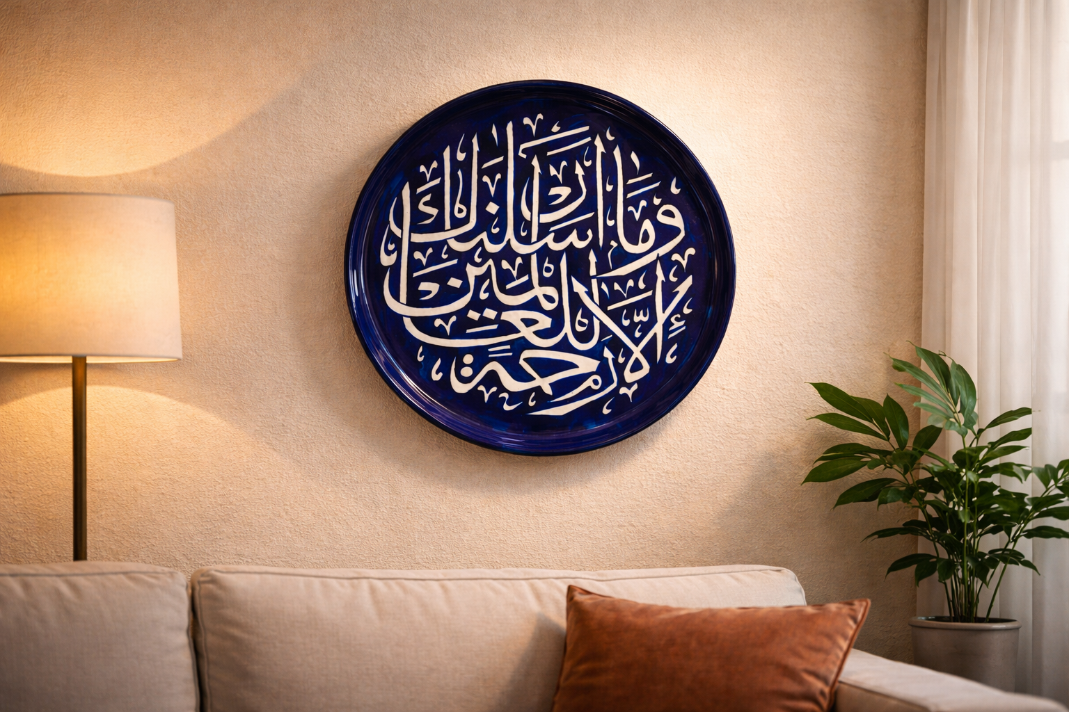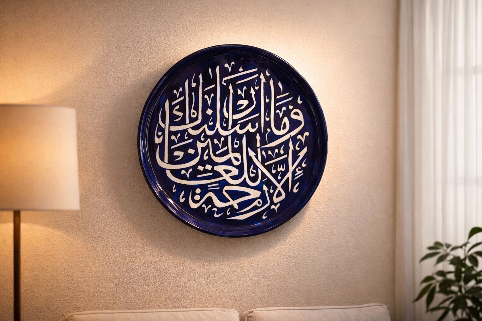 A luxurious 16-inch handcrafted Islamic wall plate featuring elegant Arabic calligraphy on premium glazed ceramic. Designed to elevate modern and traditional interiors with timeless spiritual beauty.