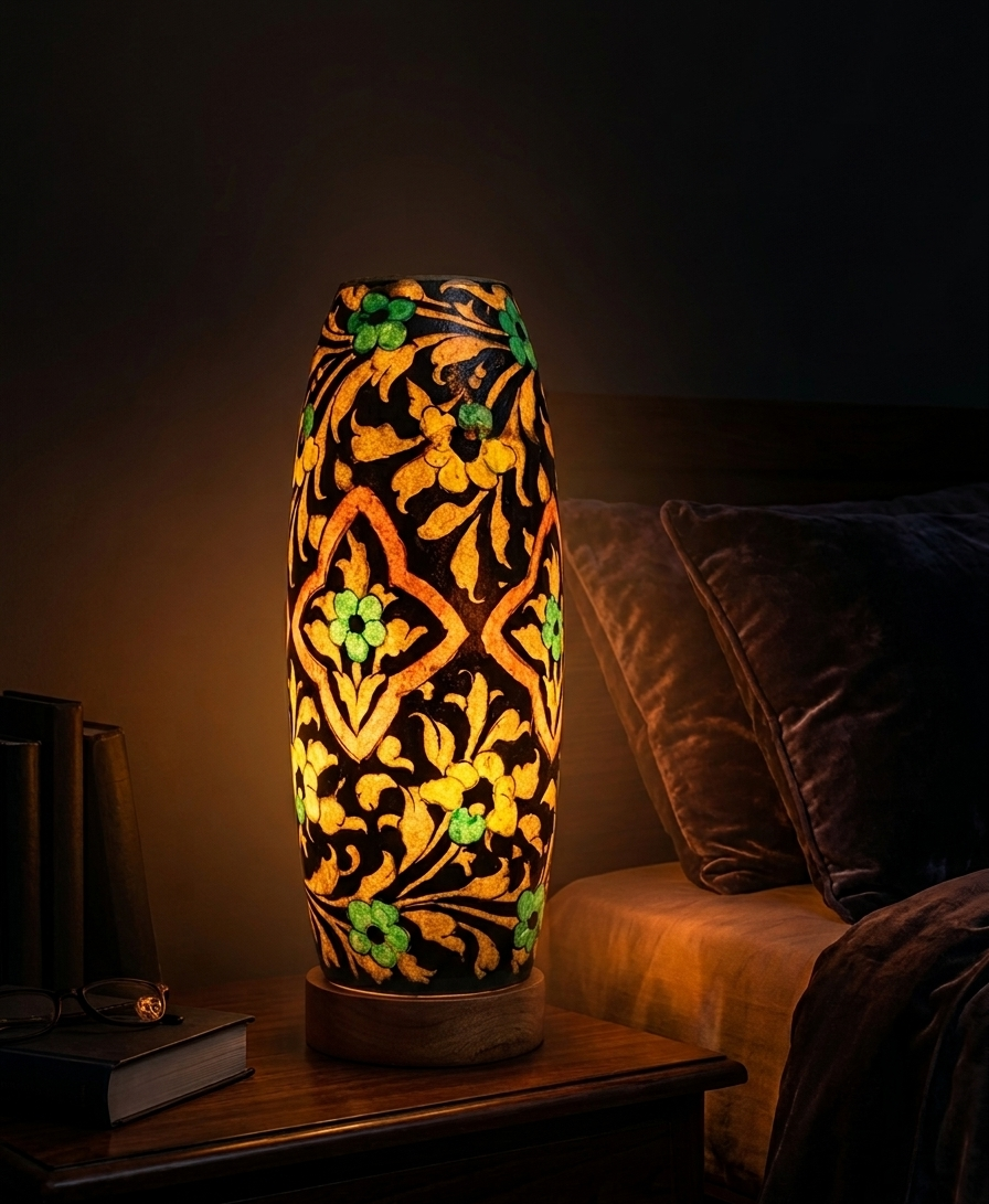 When illuminated, the lamp emits a soft, ambient glow that beautifully enhances the detailed artwork, creating a relaxing and cozy atmosphere. The contrast of warm golden light with dark floral patterns makes it a statement décor piece for modern and traditional interiors alike.