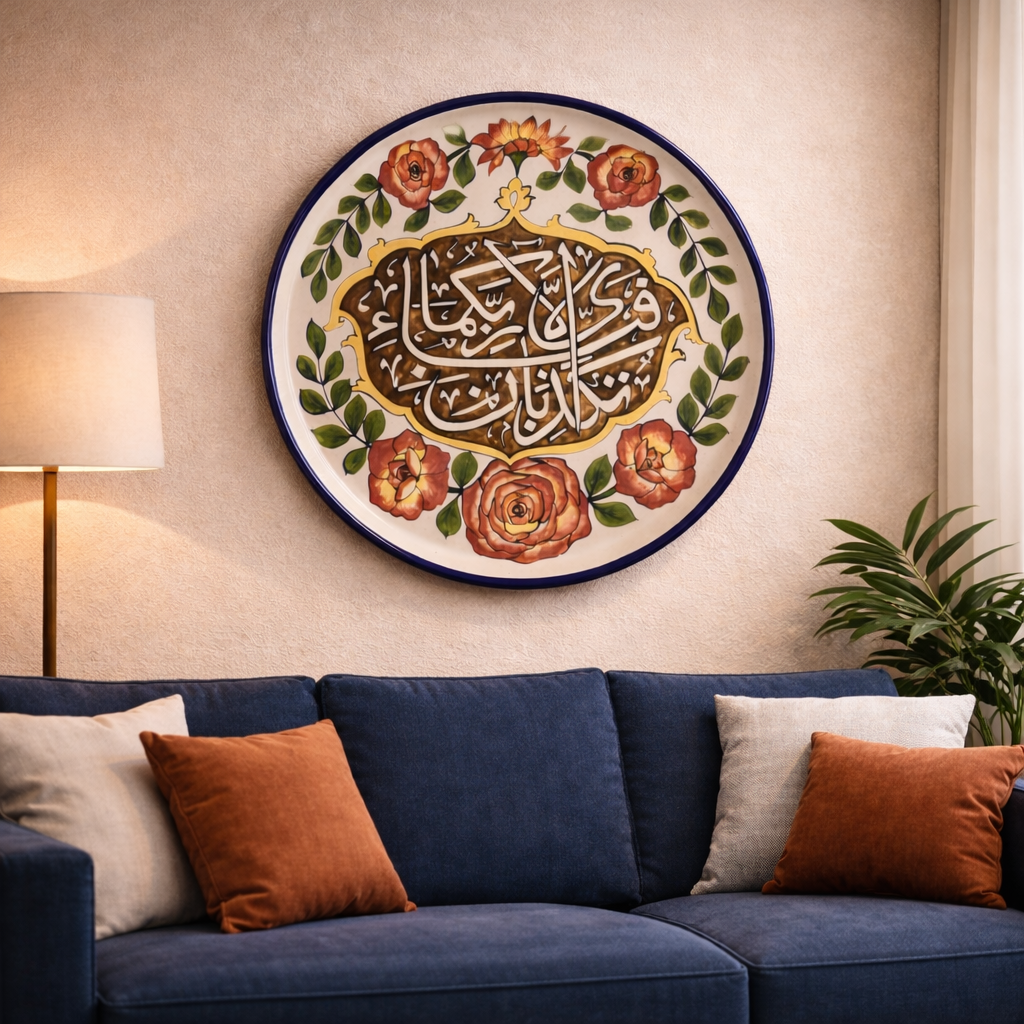 Elevate your space with this 16-inch handcrafted Islamic ceramic wall plate, featuring exquisite Arabic calligraphy framed by hand-painted floral motifs. A timeless luxury décor piece that blends faith, art, and craftsmanship.
