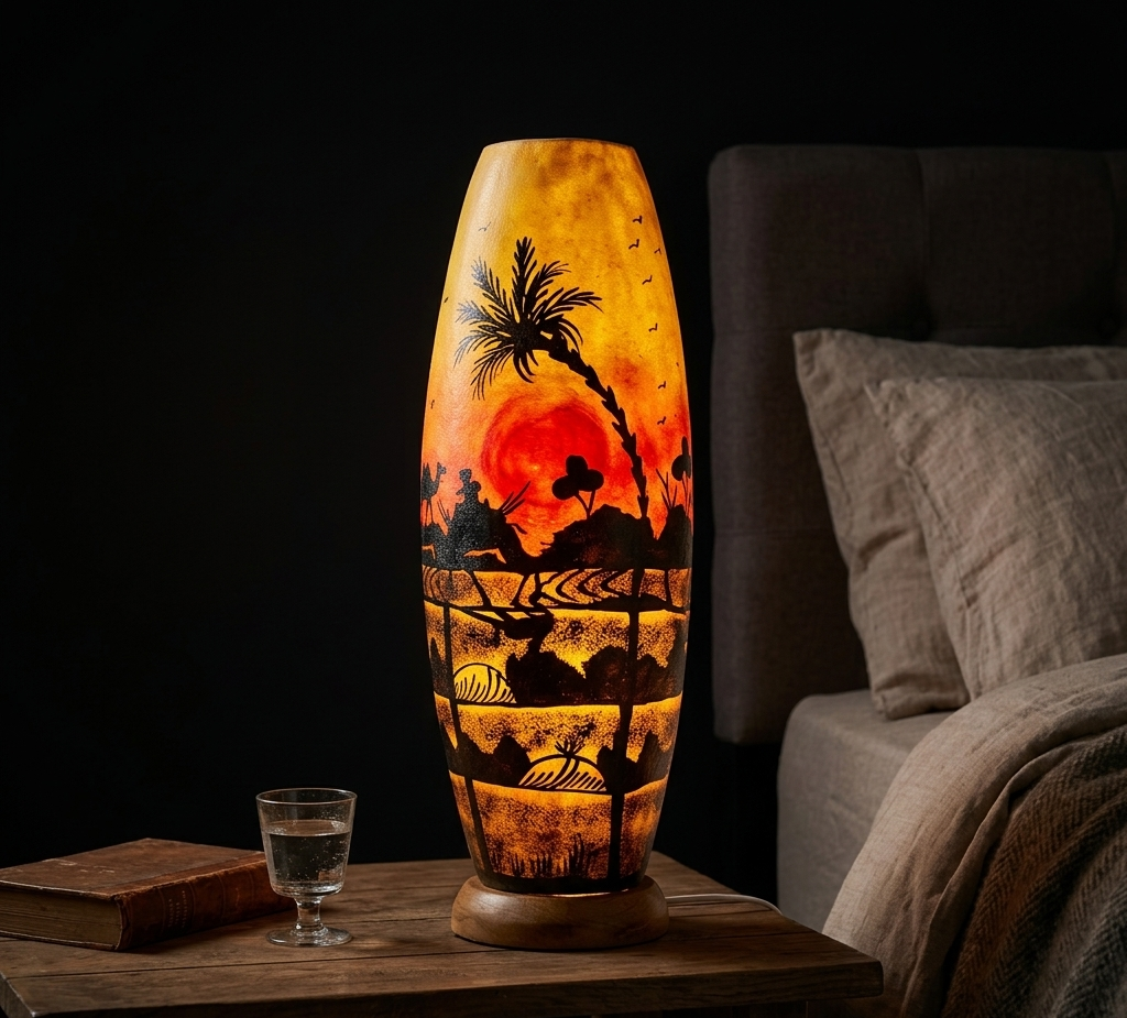 Transform your home with the beauty of traditional craftsmanship through this 20 Inch Handmade Camel Skin Lamp (Palm Sunset Caravan Design). Expertly handcrafted by skilled artisans, this lamp features finely stretched camel skin, hand-painted with a mesmerizing sunset desert landscape, complete with palm trees and a traveling caravan.