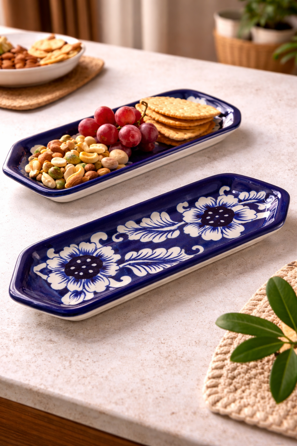Enhance your table presentation with this 6-inch Handmade Blue Pottery Serving Tray, beautifully crafted with traditional blue and white floral patterns. Designed in a sleek rectangular shape, this ceramic snack plate combines timeless craftsmanship with modern elegance.
