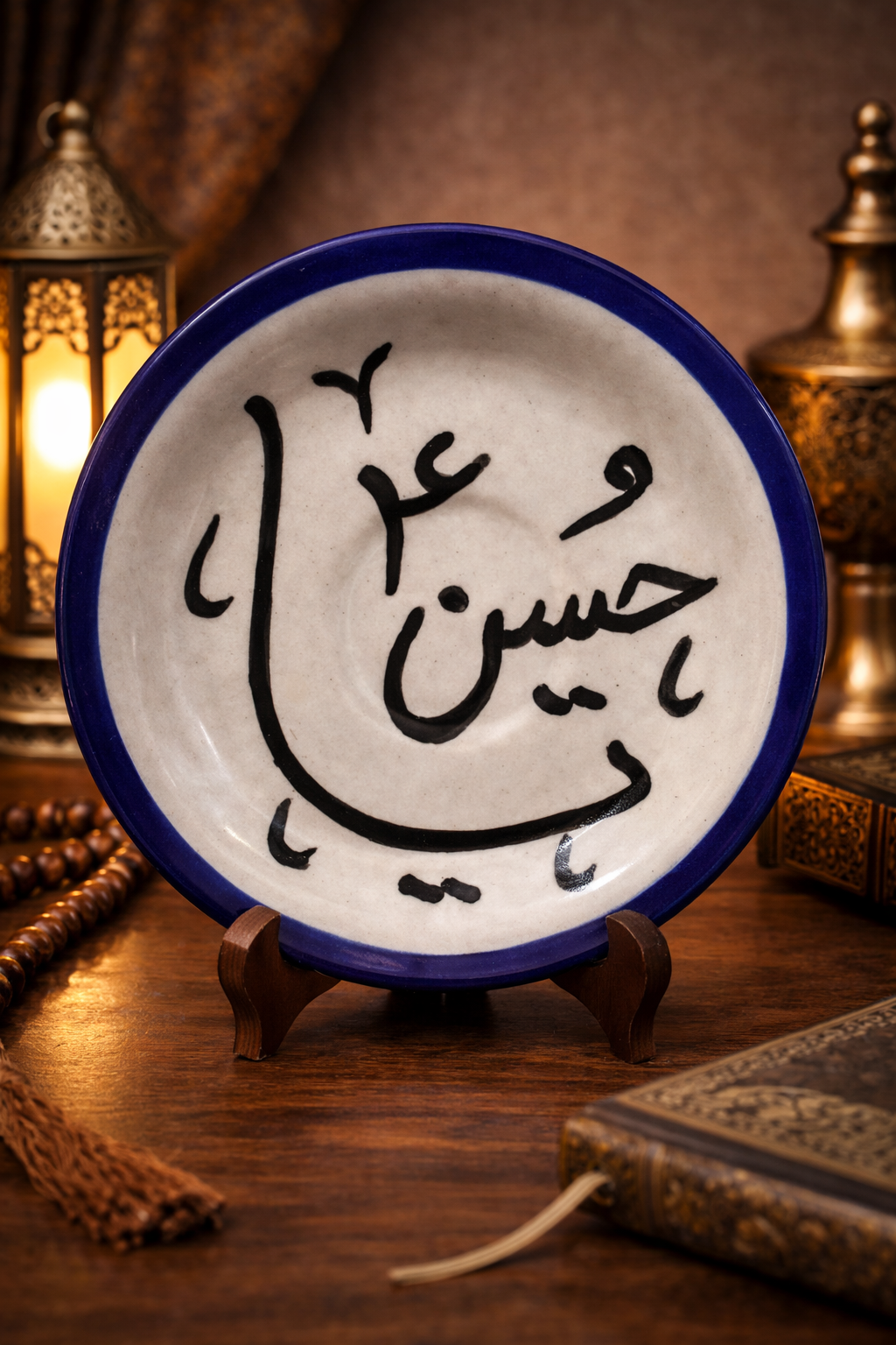 Add a touch of devotion and elegance to your space with this beautifully handcrafted 6-inch ceramic plate featuring “Ya Hussain (AS)” in graceful Islamic calligraphy.