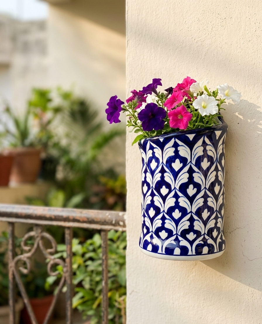 Each planter is individually handcrafted, making every piece slightly unique — a true representation of artisan blue pottery art. The elongated silhouette makes it ideal for trailing plants like ivy, money plant, eucalyptus stems, or small flowering plants that gently cascade downward, creating a natural and balanced visual appeal.