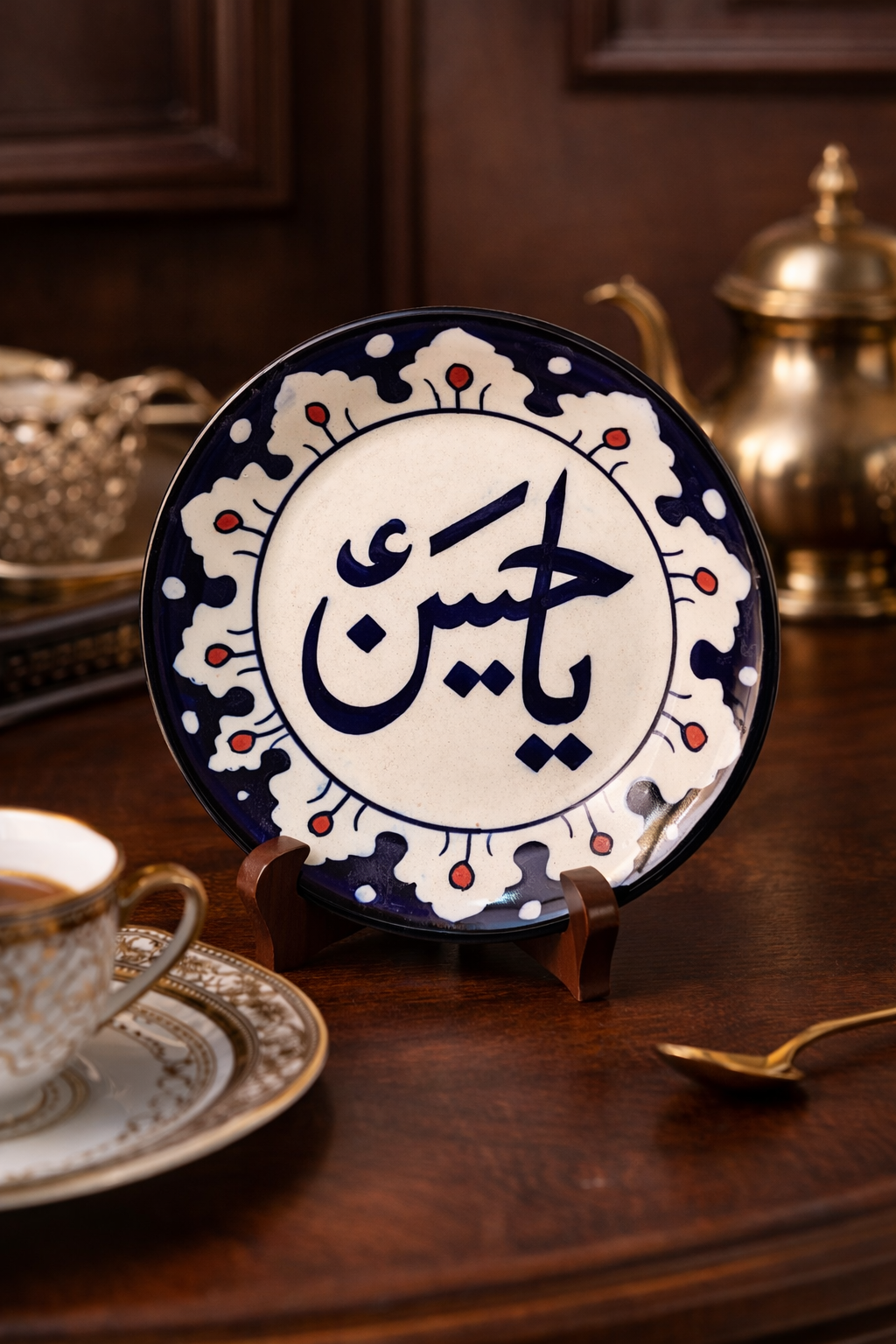Enhance your home with spiritual elegance and timeless craftsmanship through this 8-inch Handcrafted Blue Pottery Ya Hussain Plate. Carefully hand-painted by skilled artisans, this ceramic plate features bold Islamic calligraphy beautifully centered within a traditional cobalt blue and white design.