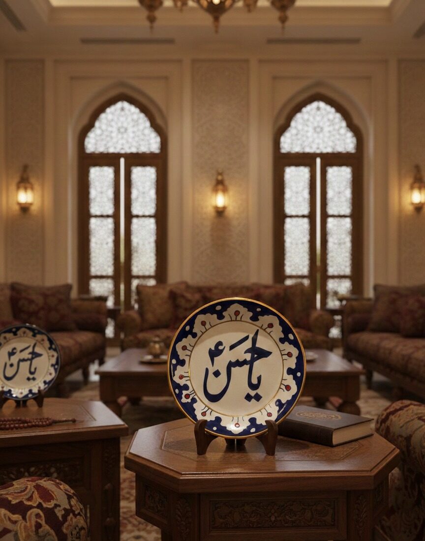 The symmetrical border design combined with the powerful “Ya Hassan” inscription creates a striking focal point that elevates any interior setting. Whether displayed on a wooden table, shelf, or decorative stand, it adds warmth, depth, and spiritual beauty to the space.