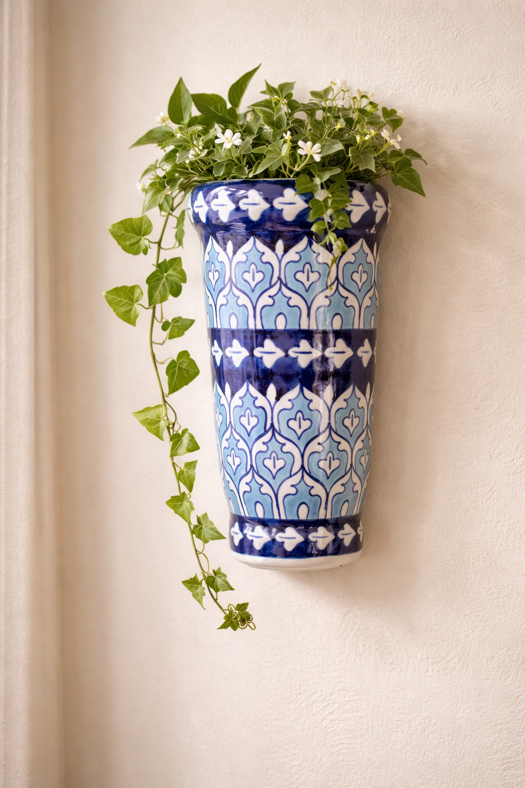Bring timeless craftsmanship and natural beauty into your home with this 9-inch handmade blue pottery wall planter. Designed in a graceful long vertical shape, this ceramic planter features traditional blue pottery patterns inspired by classic Islamic and Persian art.