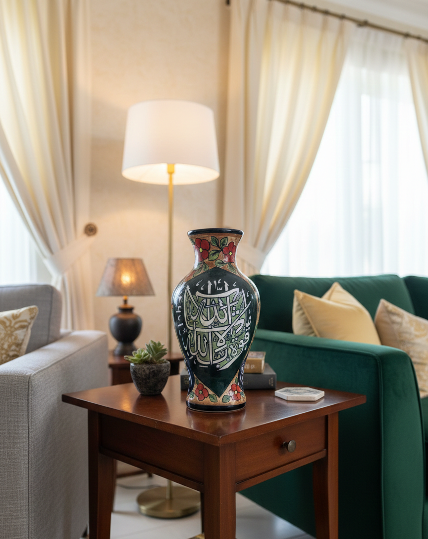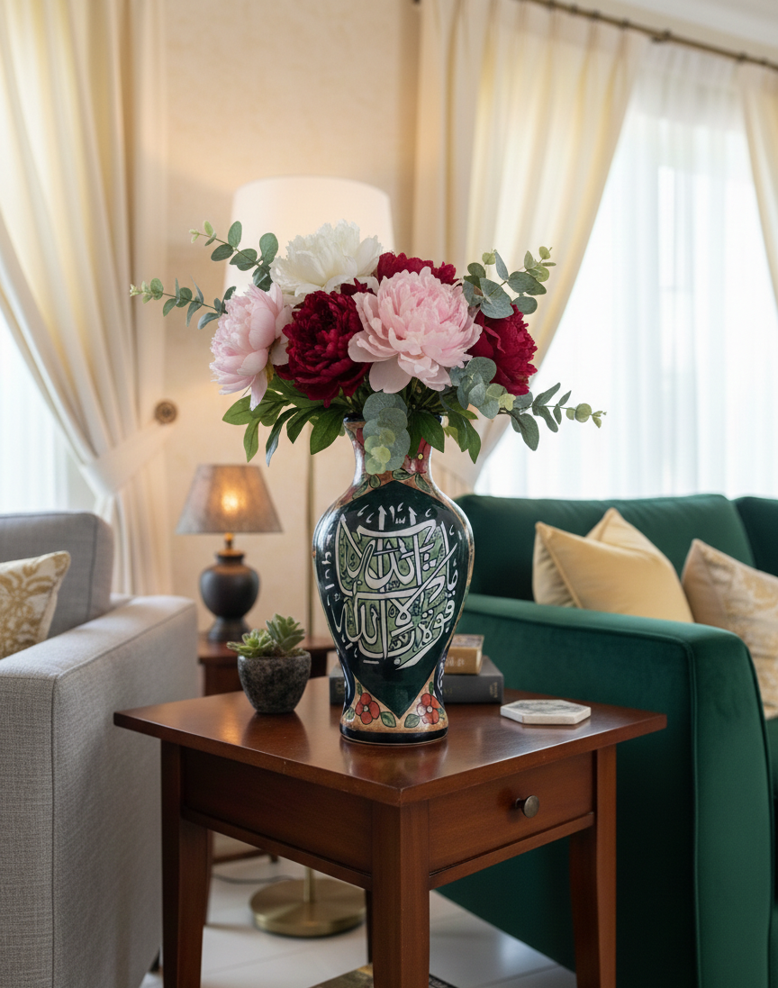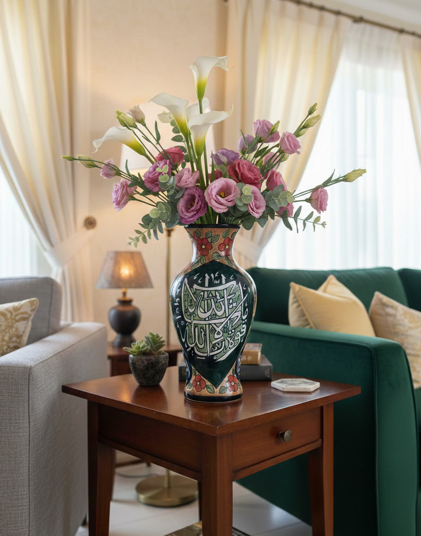 Exquisite Craftsmanship Each vase is meticulously decorated by hand. The central panel showcases beautiful Arabic calligraphy, framed by vibrant red and gold floral motifs. The hourglass silhouette is classic and versatile, ensuring it complements both contemporary and traditional interior styles.