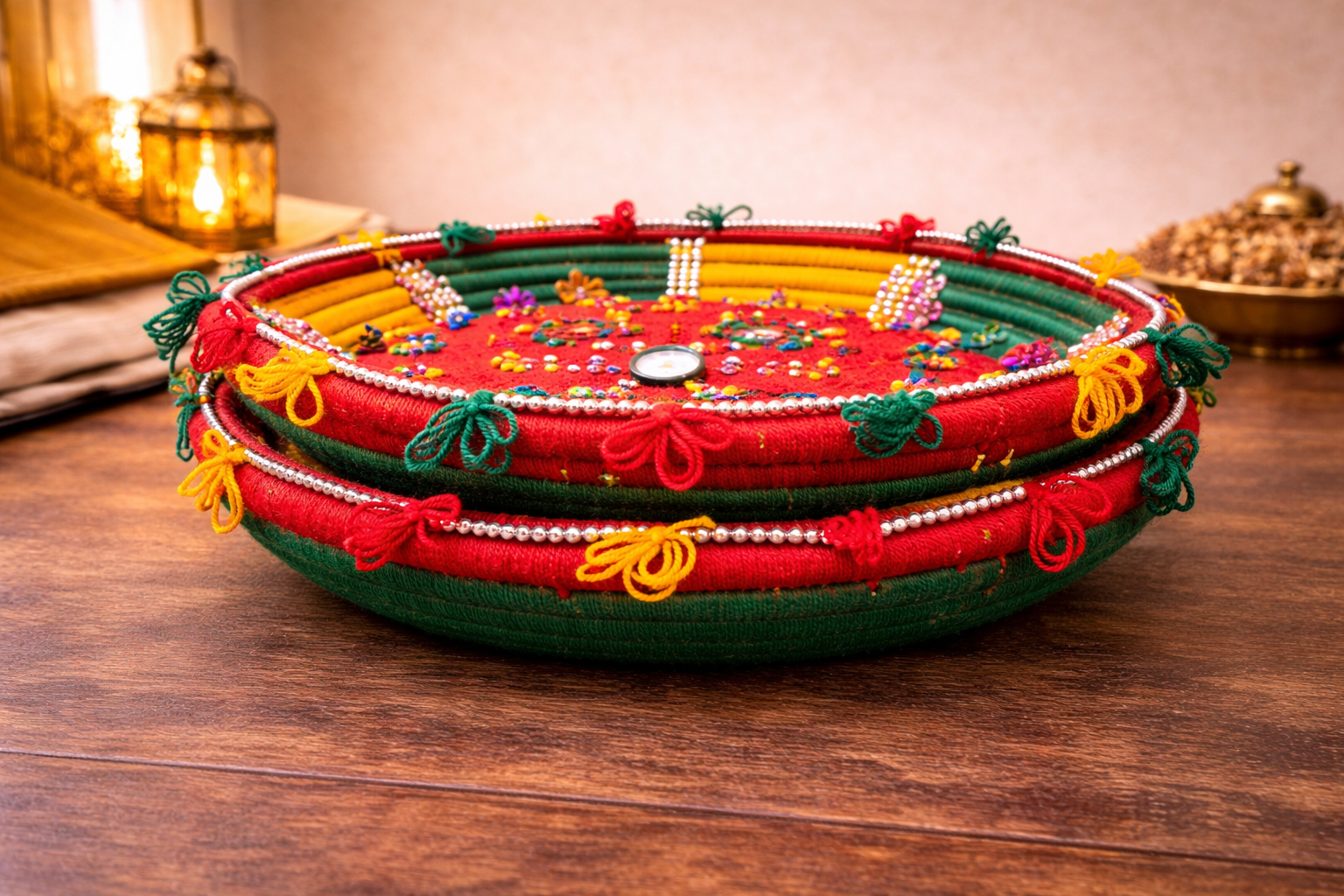 Bring heritage craftsmanship into your living space with this Handcrafted 12-Inch Chabi / Changair – Pack of 2, skillfully made by local artisans using traditional techniques. Each piece is a celebration of color, texture, and culture, designed to elevate both modern and traditional interiors.