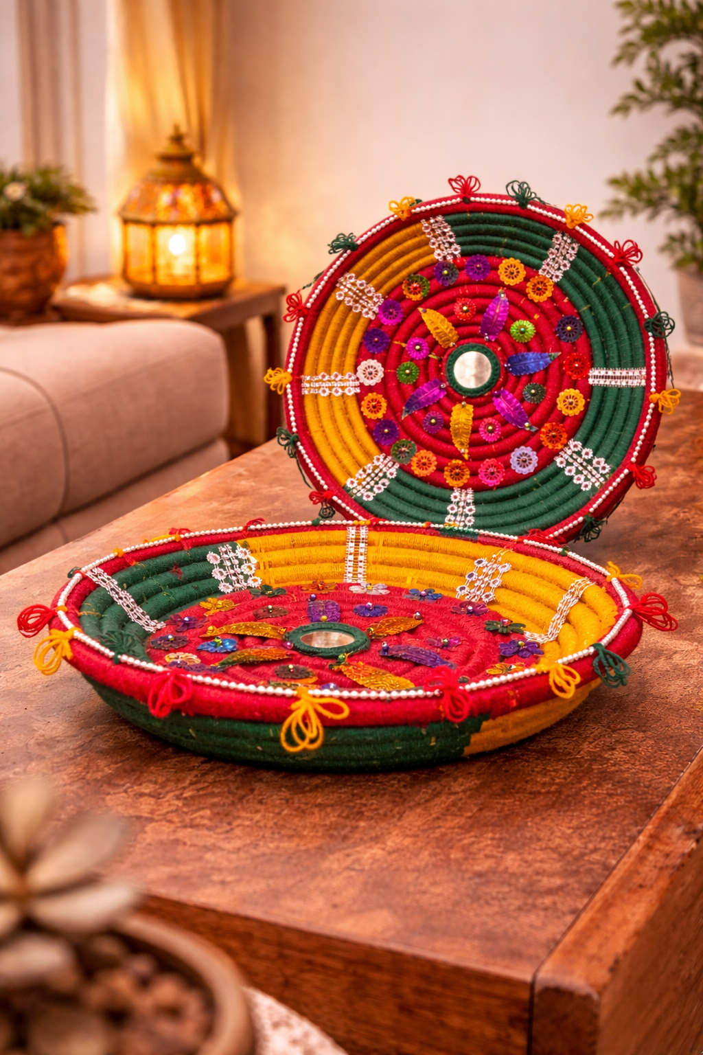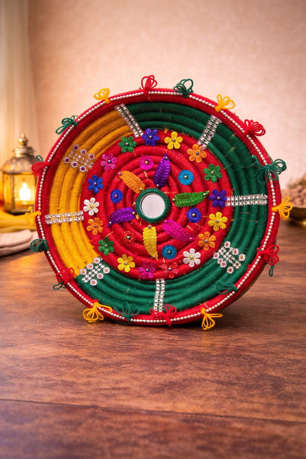 These round, plate-shaped Chabi/Changair feature intricate hand embroidery, mirror accents, beads, sequins, and colorful threadwork, finished with decorative tassels around the edges. Their slightly curved form gives them depth, making them ideal for both standing display and wall hanging.