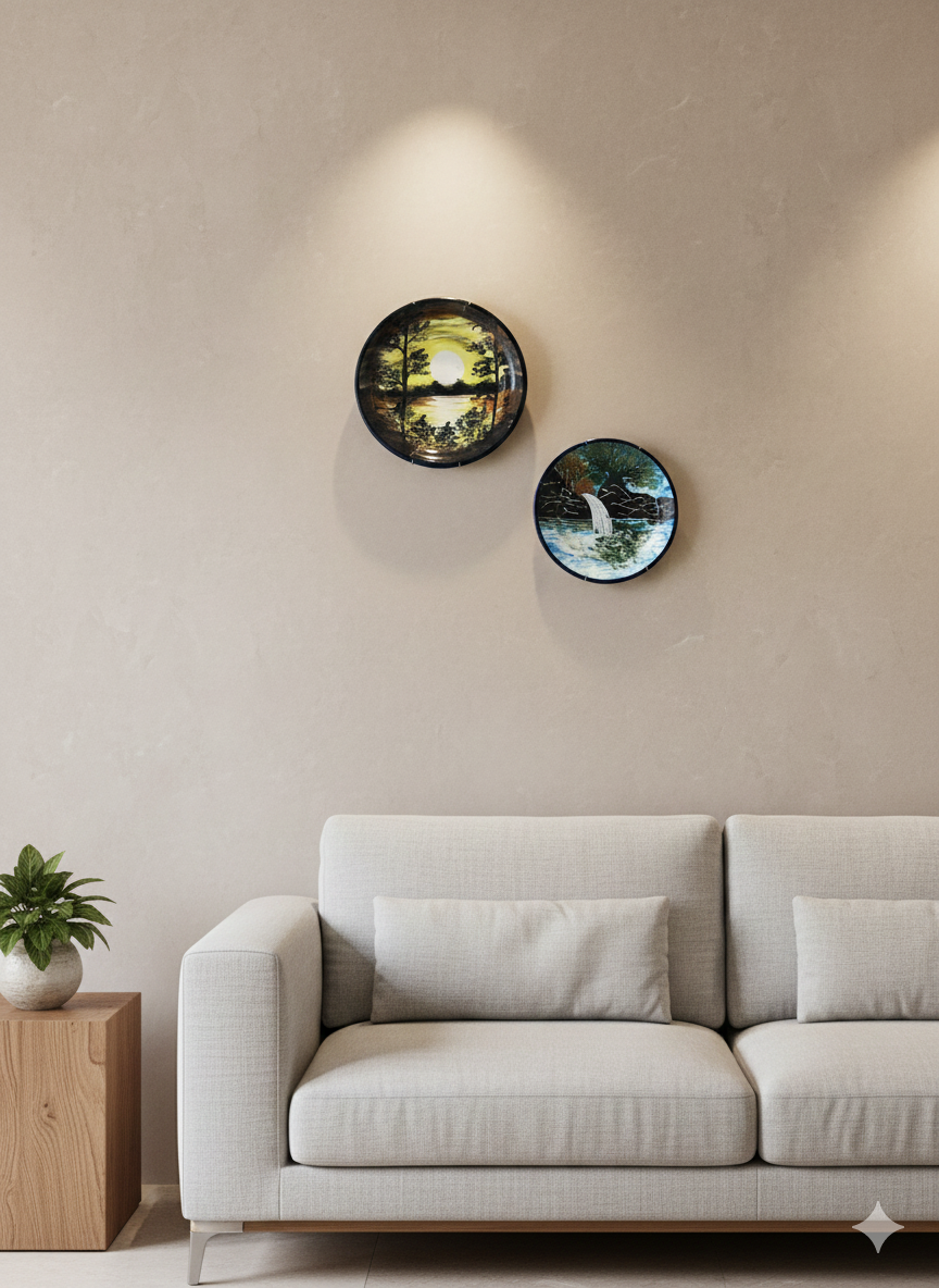 A minimalist yet striking set of two handcrafted wall plates featuring serene scenic artwork, perfect for adding elegance and calm character to modern interiors.