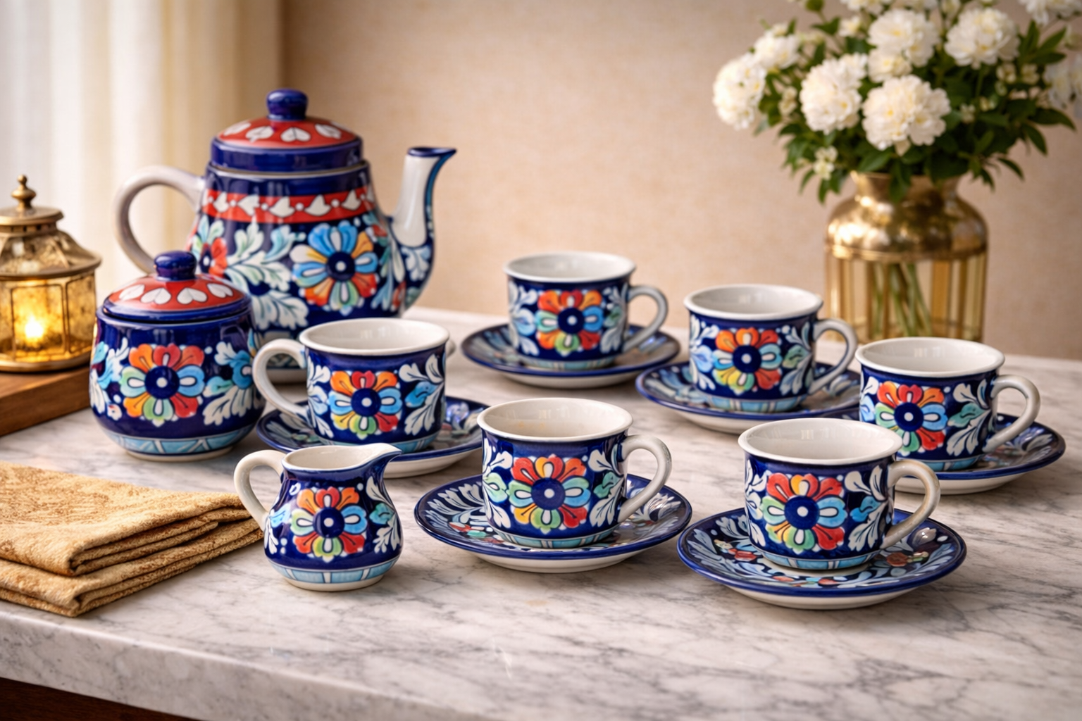 Transform your tea moments into a refined experience with this handcrafted blue pottery floral tea set, thoughtfully created by skilled artisans. Each piece is individually hand-painted with vibrant floral motifs in rich shades of blue, turquoise, red, and ivory, inspired by traditional blue pottery craftsmanship.