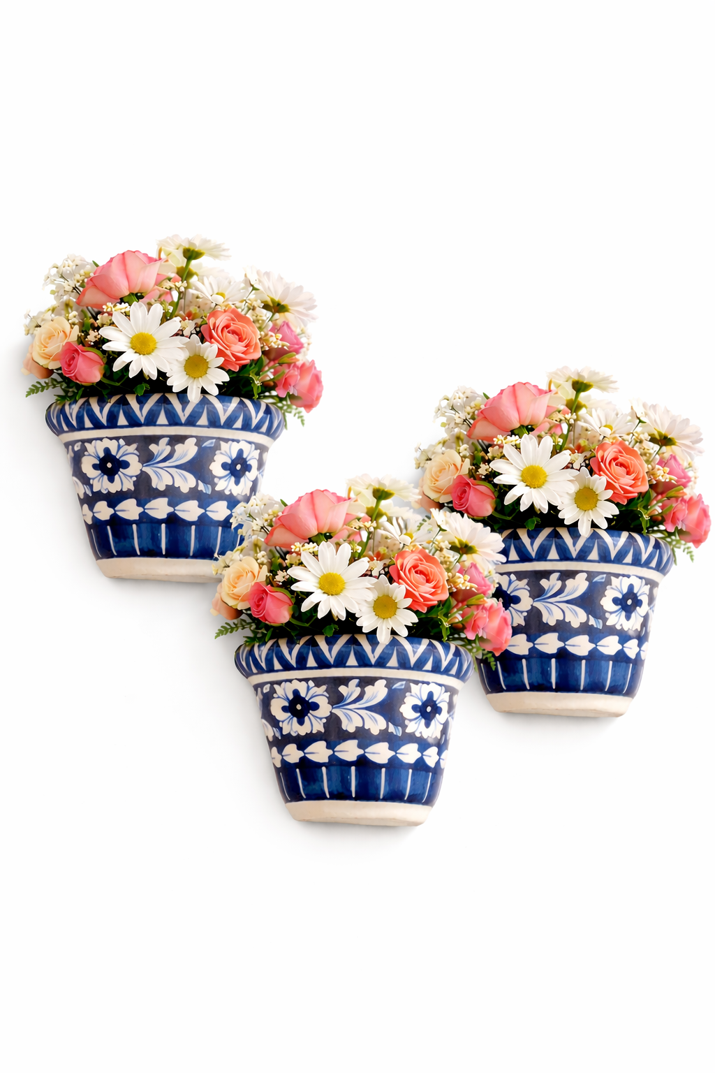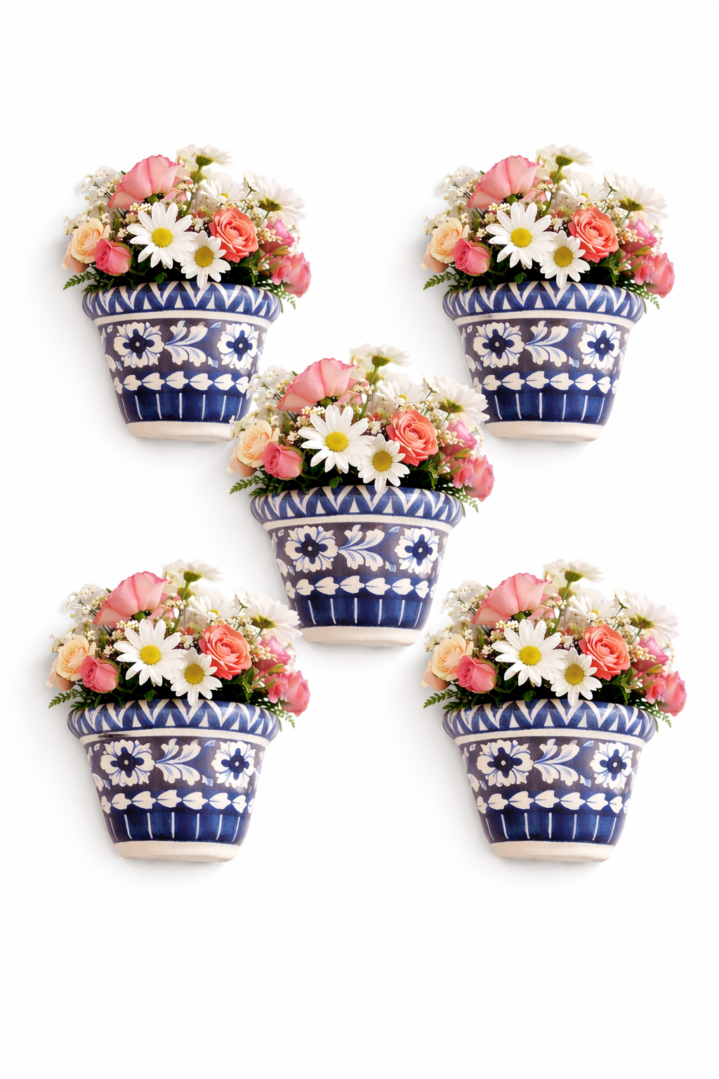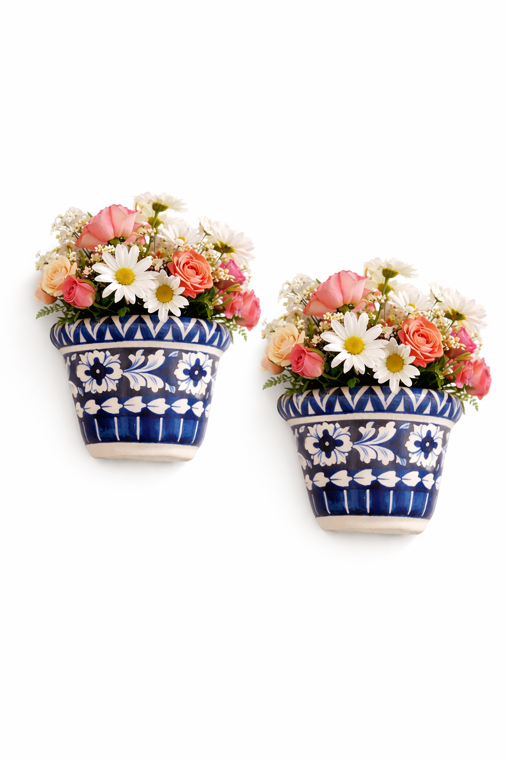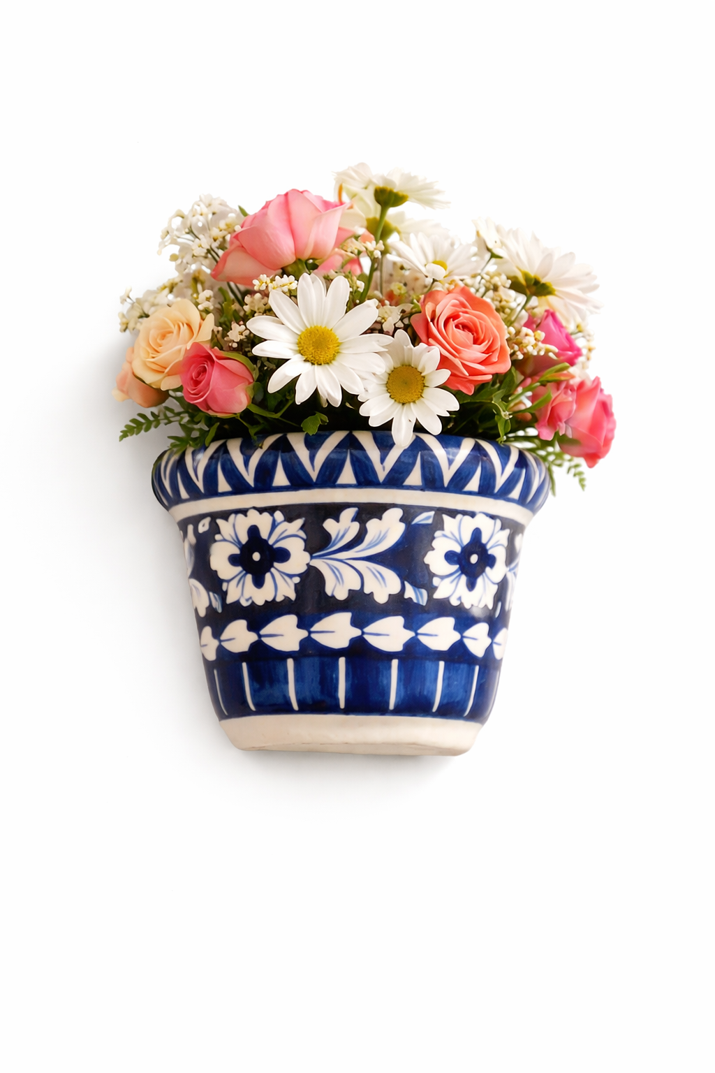 Enhance your home décor with this beautifully handcrafted blue pottery wall planter, designed to bring charm, elegance, and a touch of tradition to your interior spaces. Made from high-quality ceramic, this decorative hanging flower pot features intricate white floral motifs on a deep cobalt blue base, inspired by classic artisan pottery designs.