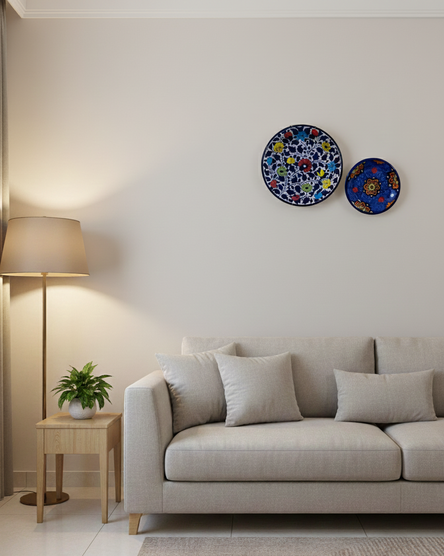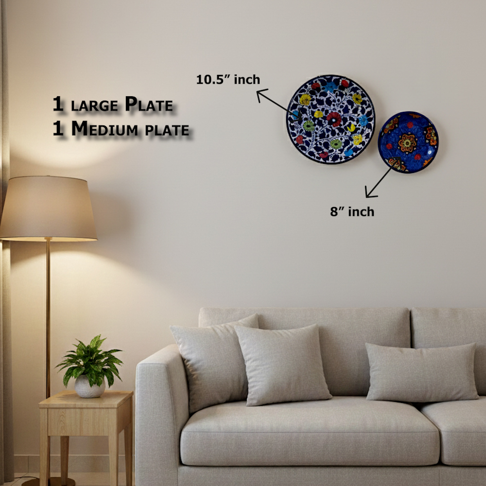 Bring heritage craftsmanship into your home with this Handcrafted Blue Pottery Wall Plate Set, thoughtfully designed to elevate modern and traditional interiors alike. This exclusive set includes one large 10.5-inch plate and one medium 8-inch plate, making it ideal for layered wall styling or focal décor arrangements.