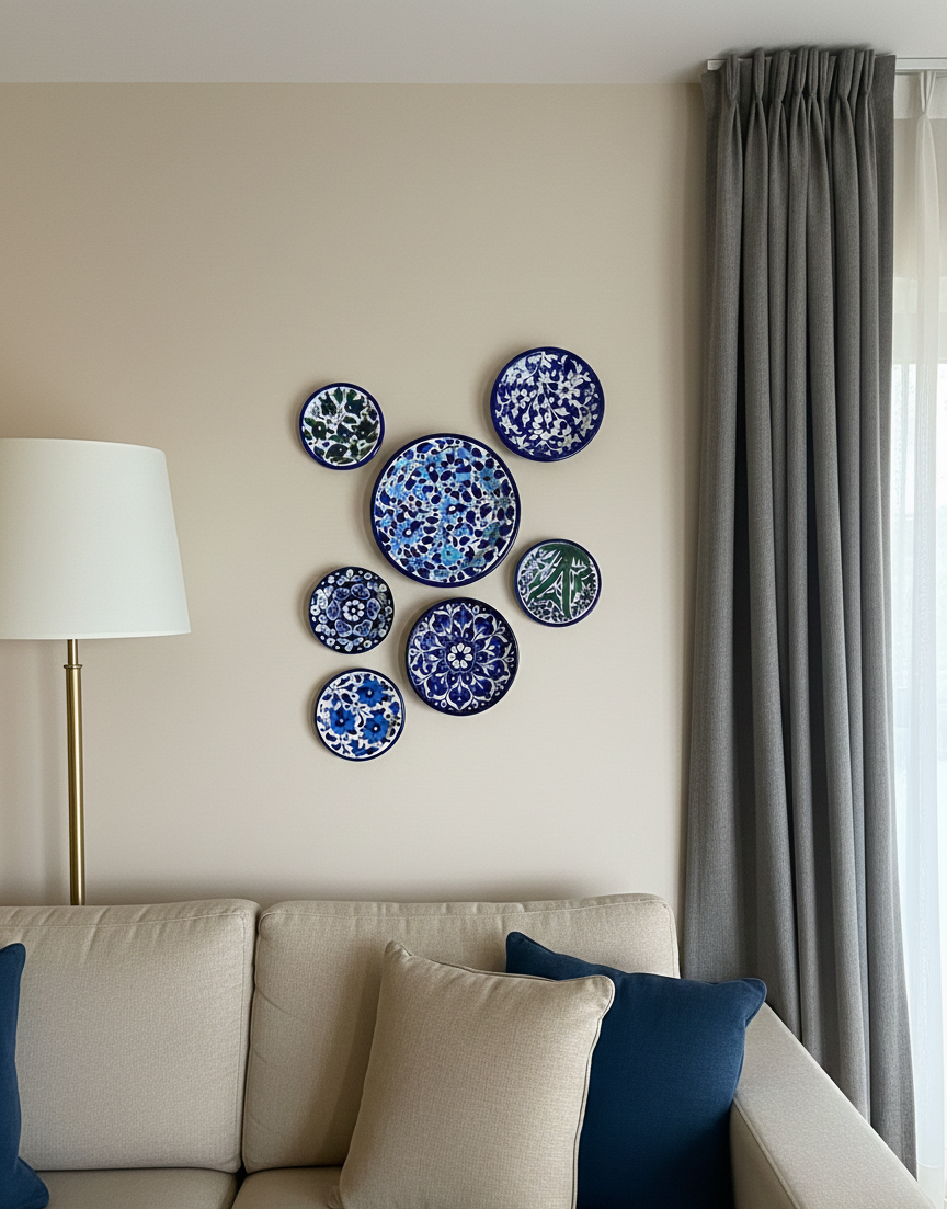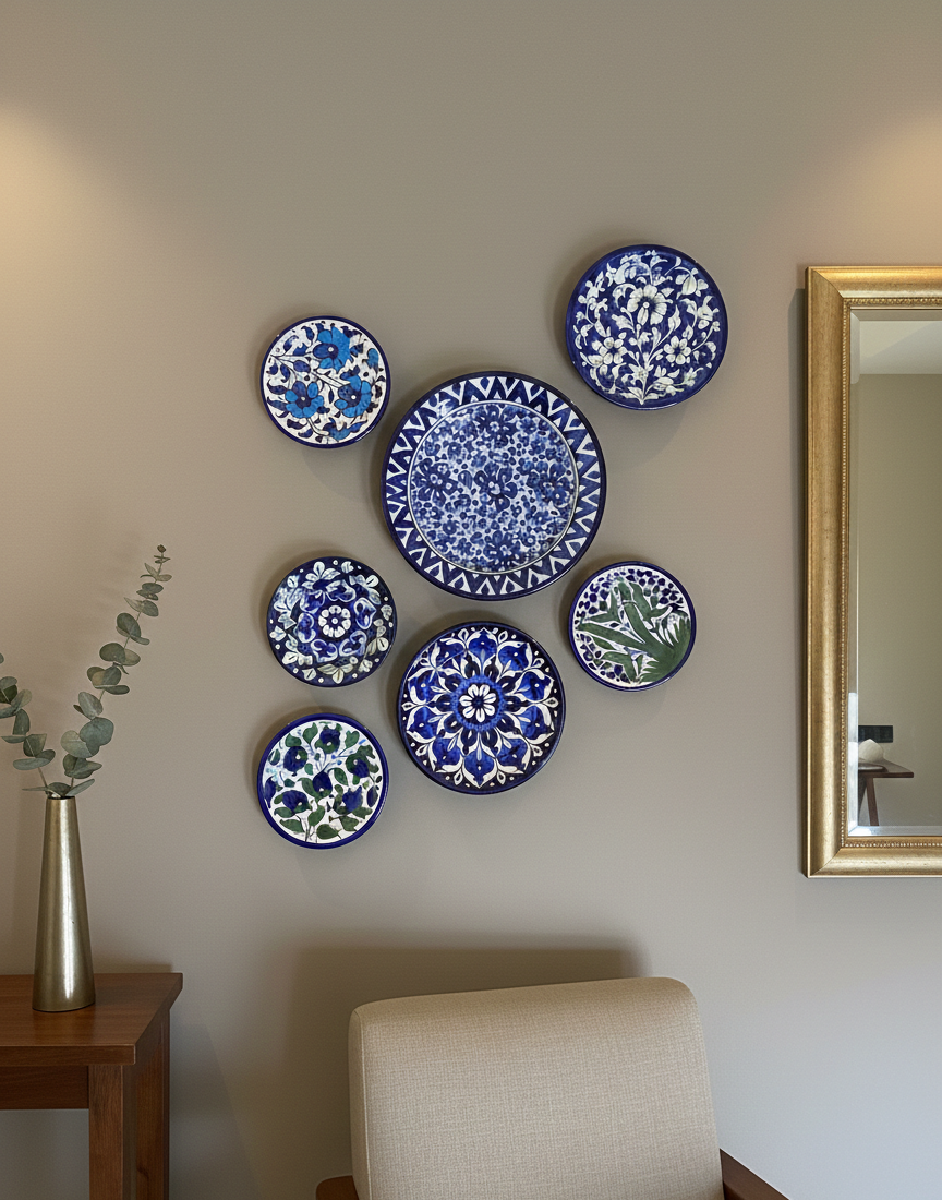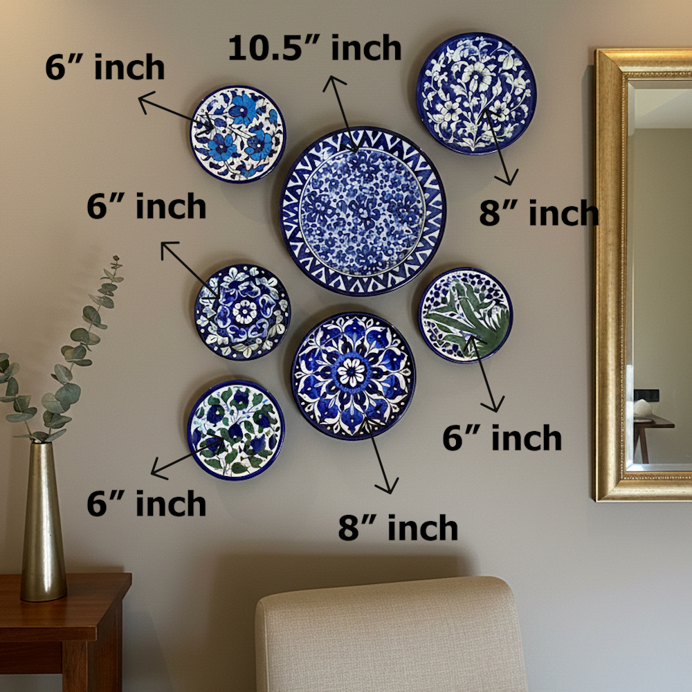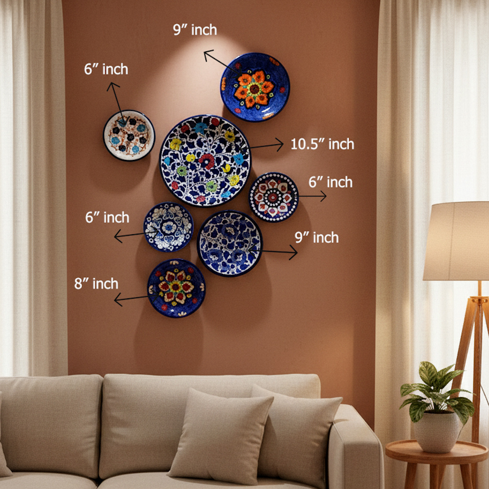 Bring timeless artistry to your living space with this exquisite 7-piece handcrafted blue pottery wall décor set. Each plate is individually hand-painted by skilled artisans, showcasing traditional floral and geometric motifs inspired by classic blue pottery craftsmanship.