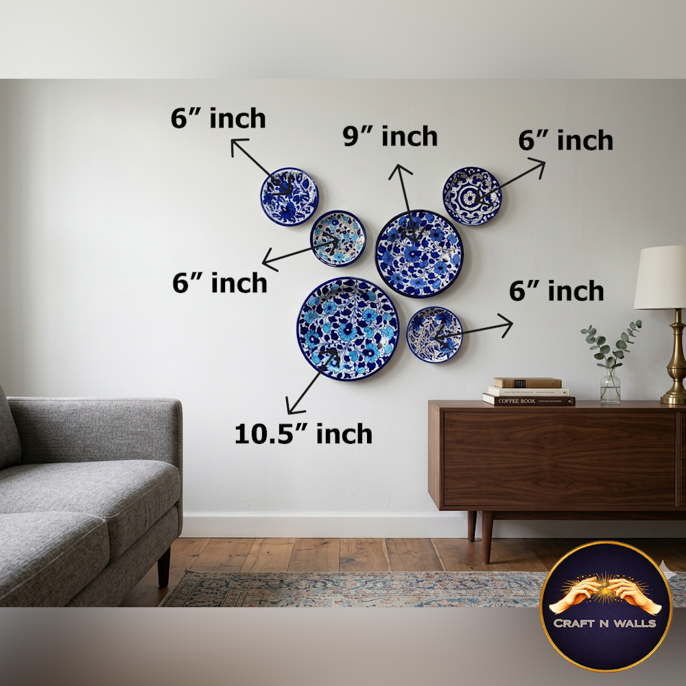 The set includes six uniquely designed plates in three carefully selected sizes—6 inch, 8 inch, and a statement 10.5 inch centerpiece—creating a perfectly balanced wall composition. The size variation adds visual depth and flow, making the arrangement ideal for living rooms, hallways, staircases, or curated gallery walls.