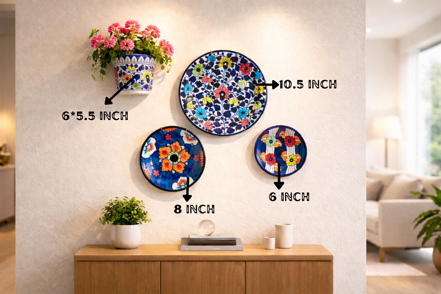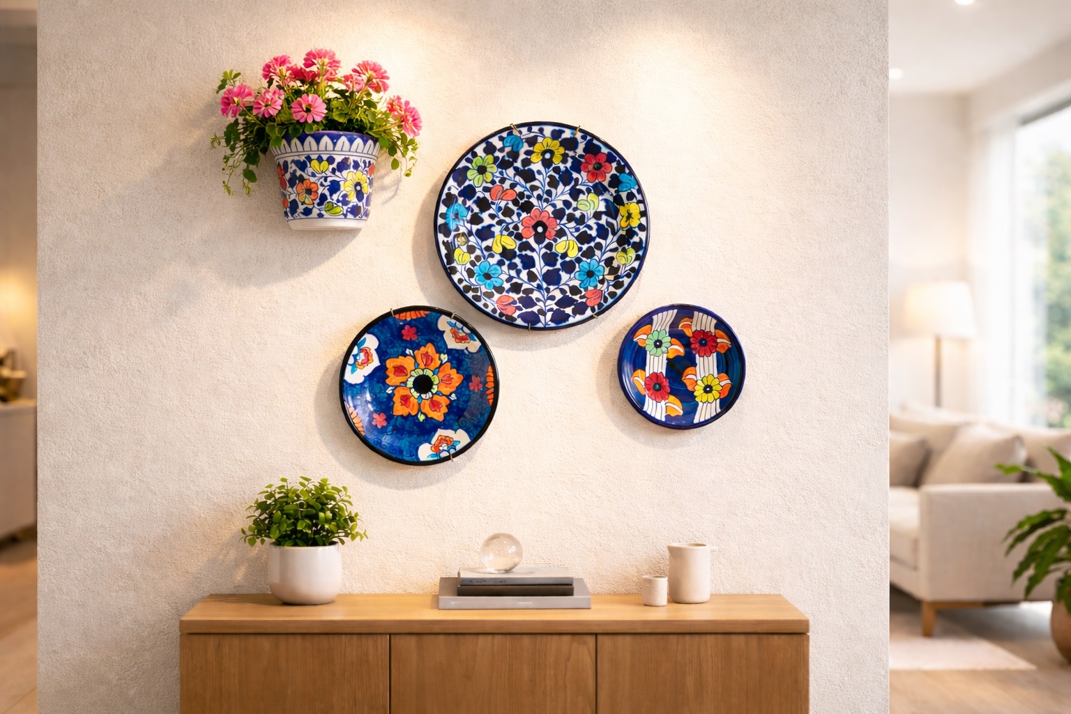 This 4-piece set includes three hand-painted blue pottery wall plates paired with a matching ceramic wall planter, creating a balanced and visually rich wall arrangement. Each piece is handcrafted by skilled artisans using authentic Multani blue pottery techniques, making every set unique in character and finish.